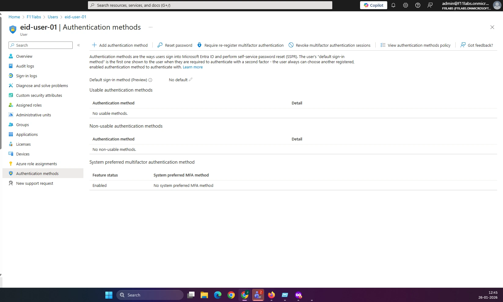 No authentication methods configured for "EID-USER-01". Refer to evidence EID-EXP-001-02-NoAuthenticationMethods.