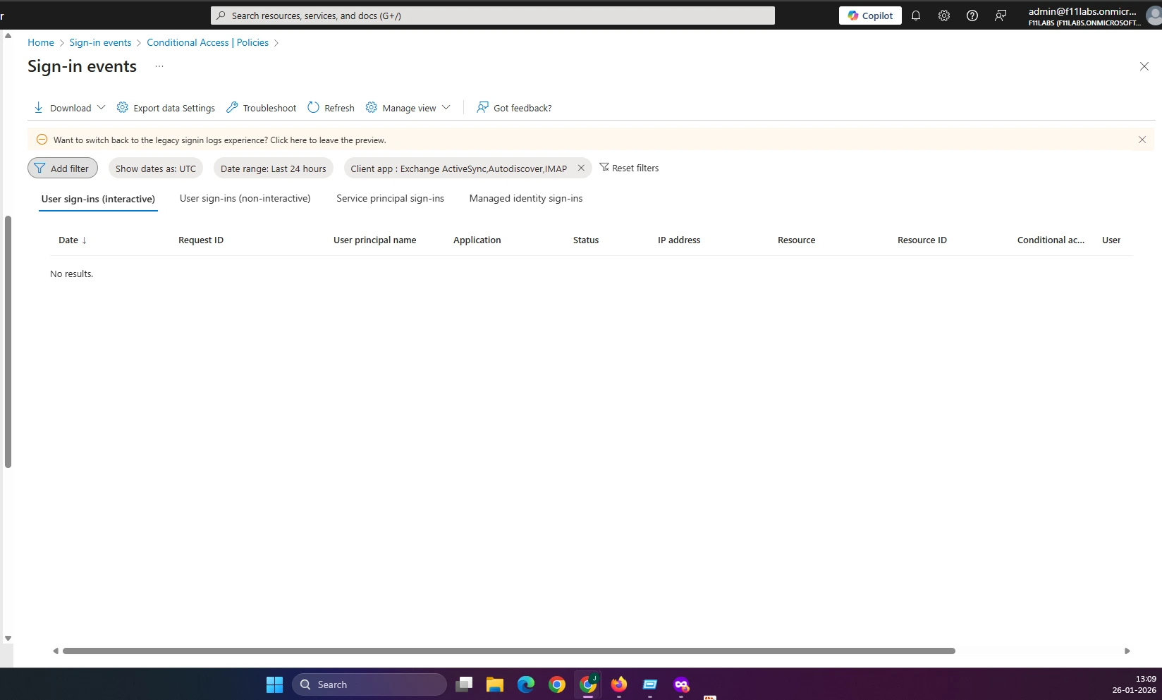 No Conditional Access policy blocks legacy authentication; although no recent legacy sign-ins were observed, the attack path remains available due to lack of explicit enforcement. Refer to evidence EID-EXP-001-03-LegacyAuth-SignInLogs