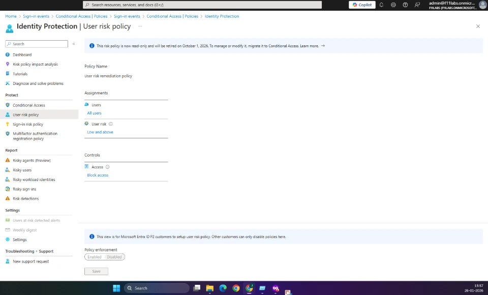 User risk policy is disabled by default. Refer to evidence EID-EXP-001-04-IdentityProtection-Empty.