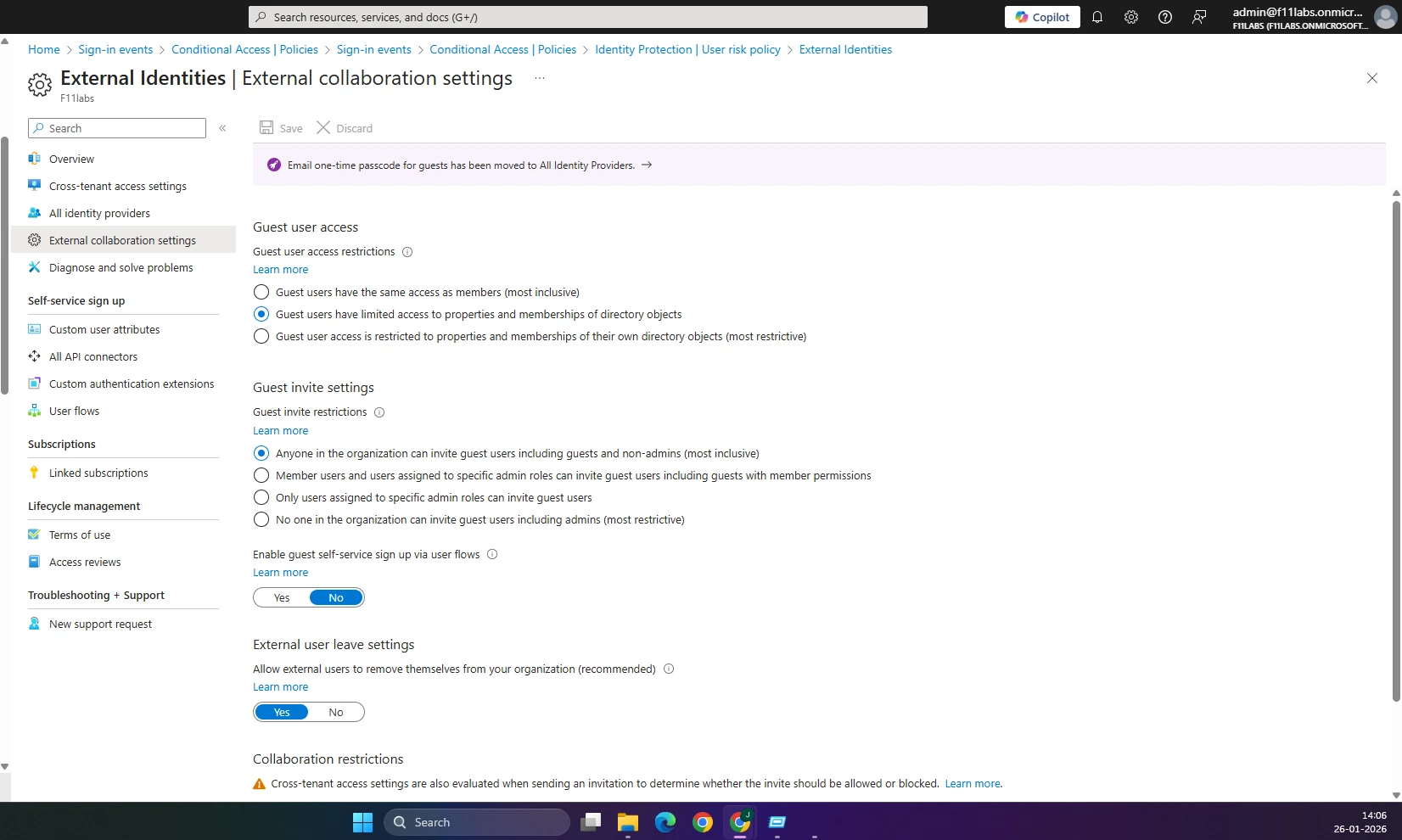 Observation: Guest access is enabled using default external collaboration settings.