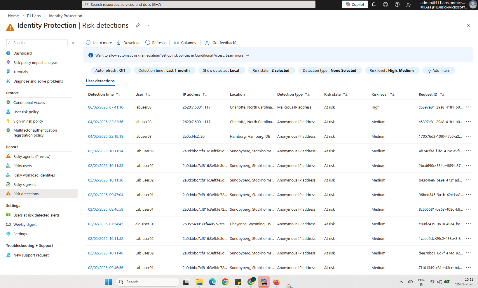 - Risk detection may take several minutes before alerts trigger.