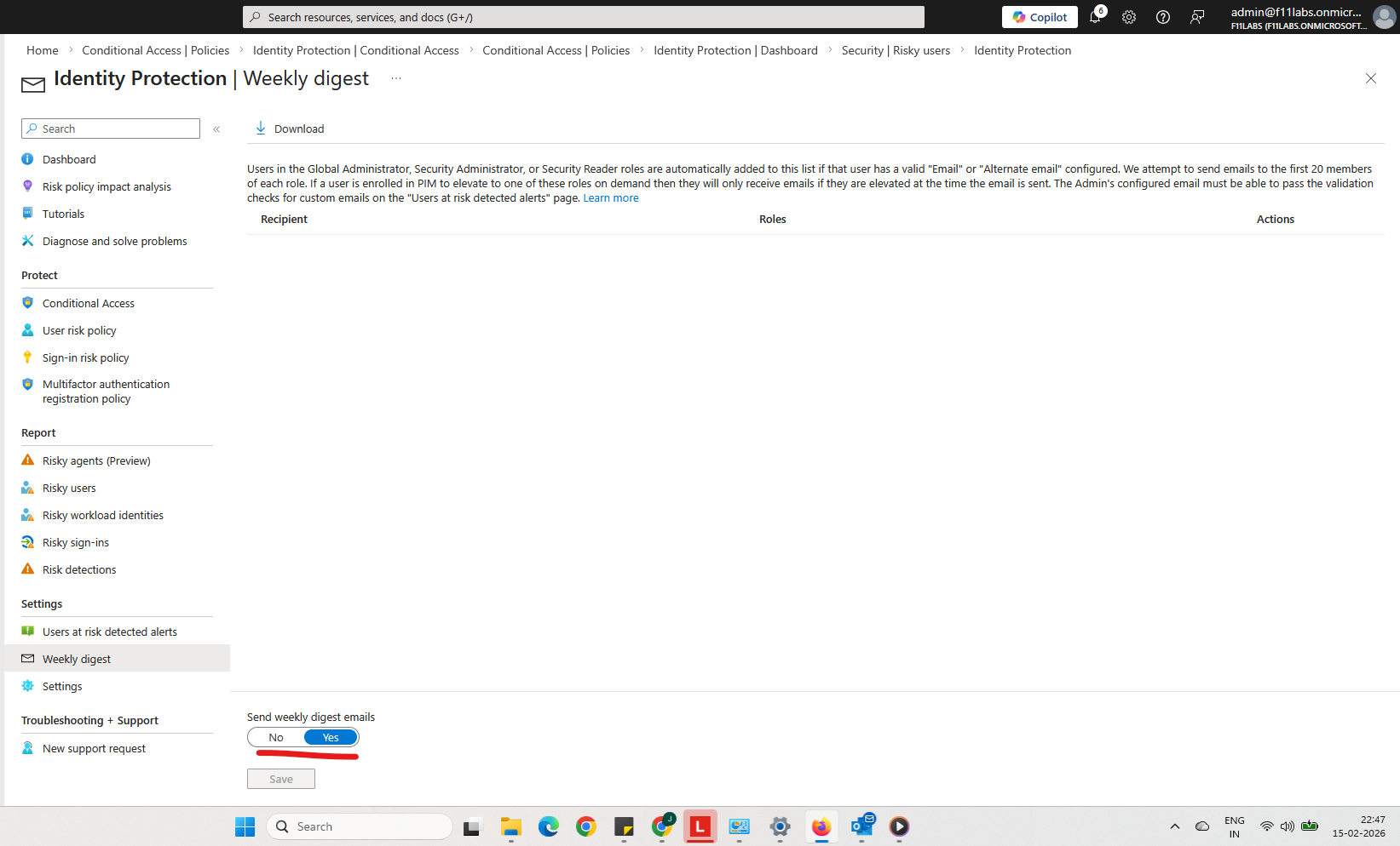 - Alerts are enabled at the Identity Protection level, but they won’t trigger unless risk events occur.